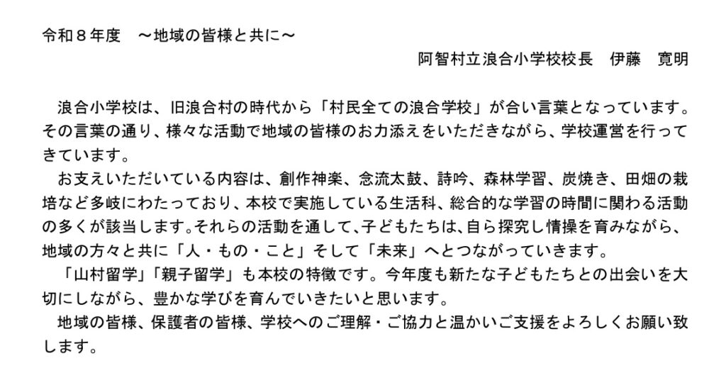 令和8年度浪合小学校は、全校児童35名、うち通年合宿センター生(山村留学生)13名で構成されています。地域の子どもと通年センター生が交流し合い、互いに刺激を与え、高め合っている様子が見られ、小人数編成によるきめ細やかな教科及び学級指導、基礎学力を応用発展させる指導・支援、豊かな自然環境を活かした自然体験活動、地域を知り郷土愛を育む活動等、山間小規模校ならではの豊かな教育活動を実践しています。平成23年度より浪合中学校が阿智中学校に統合し学校の名称も浪合小中学校から浪合小学校となりましたが、旧村民の願いに立って建設された浪合学校という通称は今尚、地域の方の心に深く残っており、小学生が活躍する姿は地域に活気と希望を吹き込んでいます。