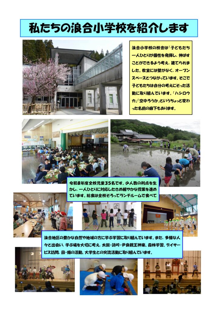 一、ゆたけき山川 月日に映えて 歴史は古き 浪合高地 この地にはぐくみ 学びに励む われらはすこやか 心も強し